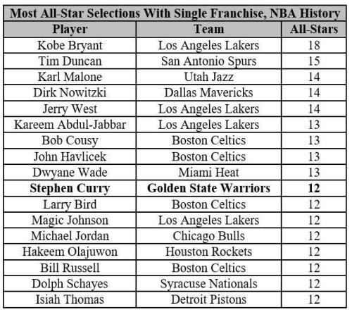 2.库里生涯12次入选全明星继续刷新勇士队史纪录,这是他第11次当选全明星首发。在NBA历史上只有17名球员在效力一支球队期间12次入选全明星,库里就是其中之一。库里是全明星赛历史命中三分球最多的球员(57),他在全明星赛的总得分216分排在全明星历史第10。37岁的库里是本届最老全明星首发球员。